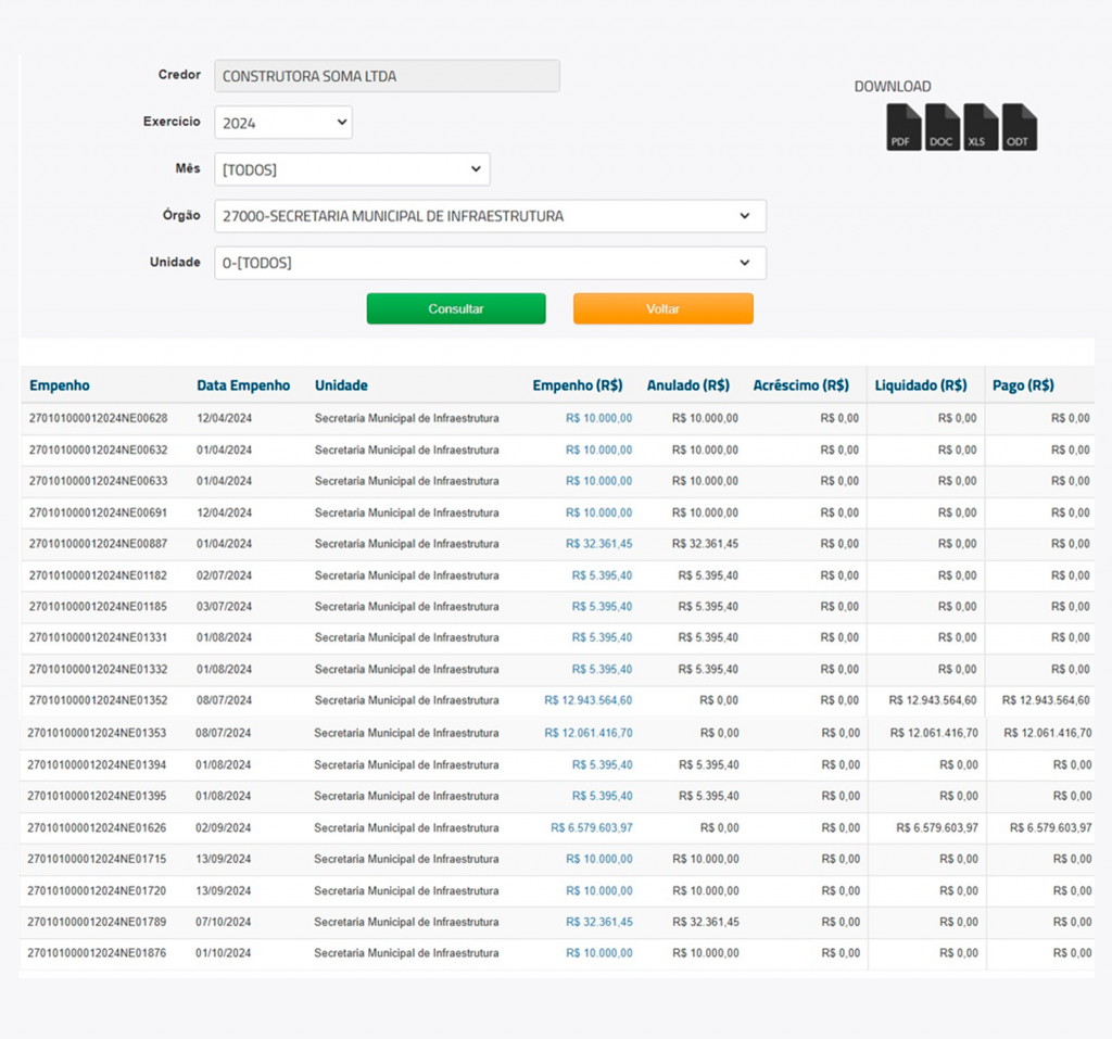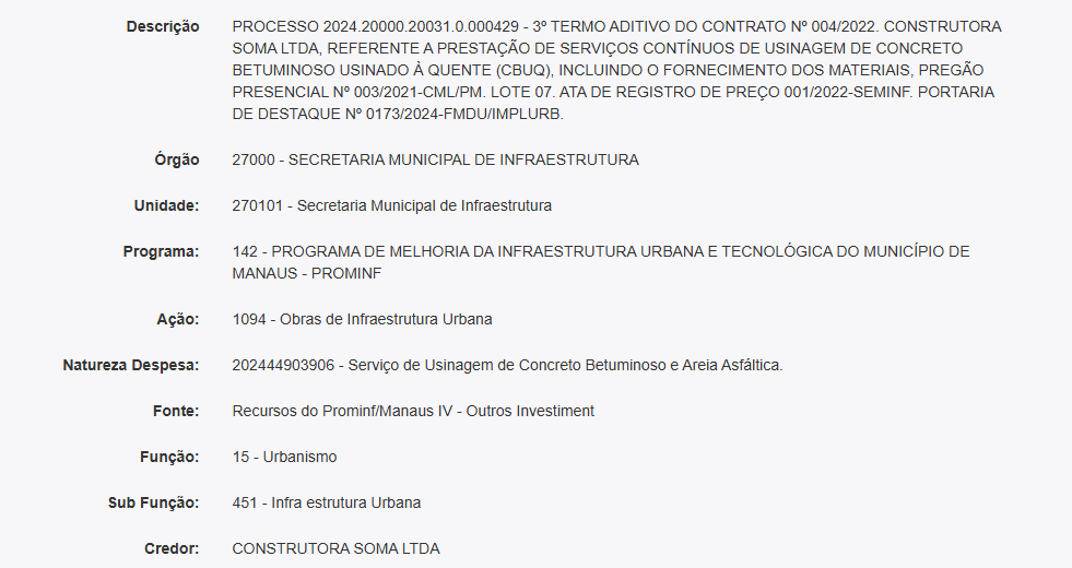 Já a Construtora Soma Ltda., especializada em obras de terraplenagem, fecha a lista das cinco empresas que mais receberam da Seminf de Manaus em 2024. Ao todo, foram cerca de R$ 31,5 milhões pagos entre 21 de agosto e 2 de outubro, por meio Programa de Melhoria da Infraestrutura Urbana e Tecnológica do Município de Manaus (Prominf).