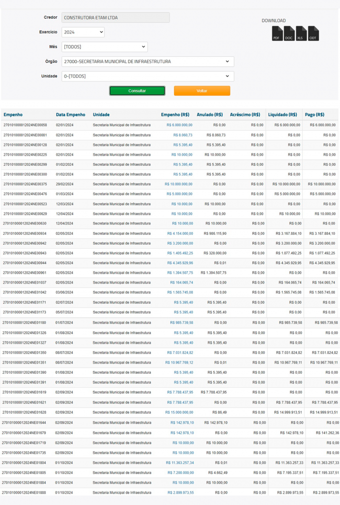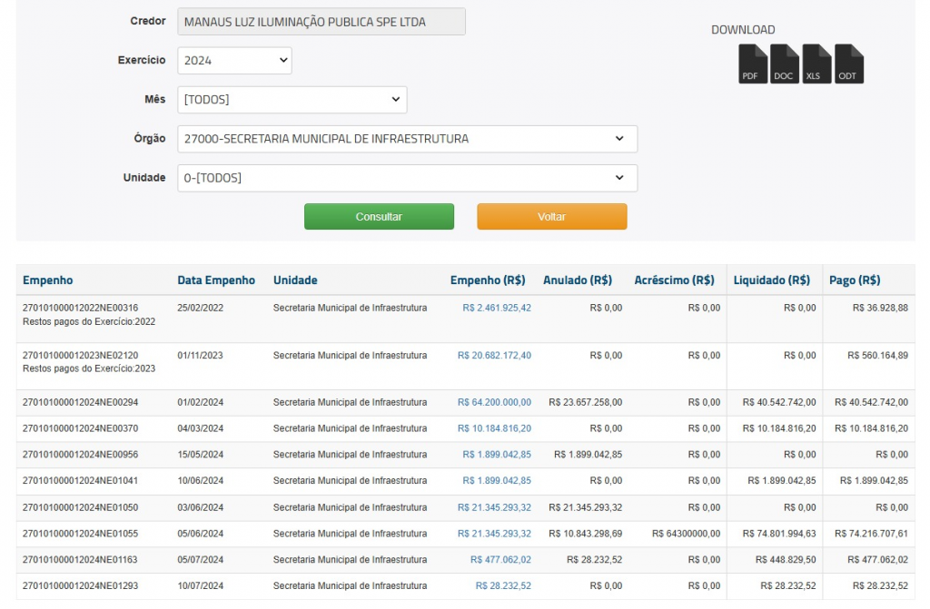 No período consultado pela CENARIUM, o maior valor pago pela pasta de Renato Junior à empresa ocorreu entre 26 de junho e 13 de dezembro, quando a Prefeitura de Manaus pagou cerca de R$ 74,8 milhões. O Portal da Transparência apontou que os pagamentos foram realizados por meio do programa Serviços de Iluminação Pública de Manaus. O montante integra o contrato global firmado entre a empresa e a Seminf. Veja: