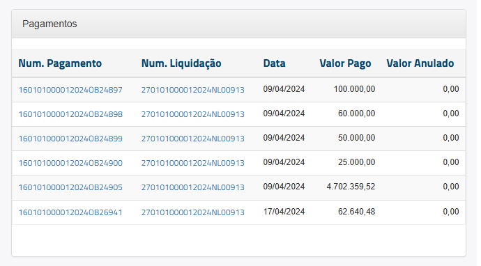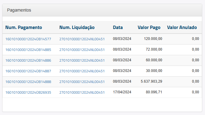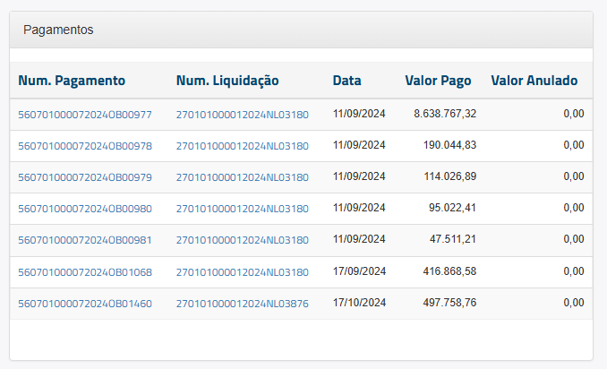 As despesas saíram do caixa do programa Serviços de Iluminação Pública e foram pagas entre os dias 20 de junho e 17 de dezembro do ano passado. “Os pagamentos serão feitos da seguinte forma: Mês de maio/2024: 2 (duas) parcelas de R$ 11.808.084,93, totalizando o valor de R$ 23.616.169,86. Nos meses de junho a novembro/2024, parcelas mensais e iguais no valor de R$ 11.808.084,93 cada”, diz trecho do demonstrativo disponível no Portal da Transparência. Veja: