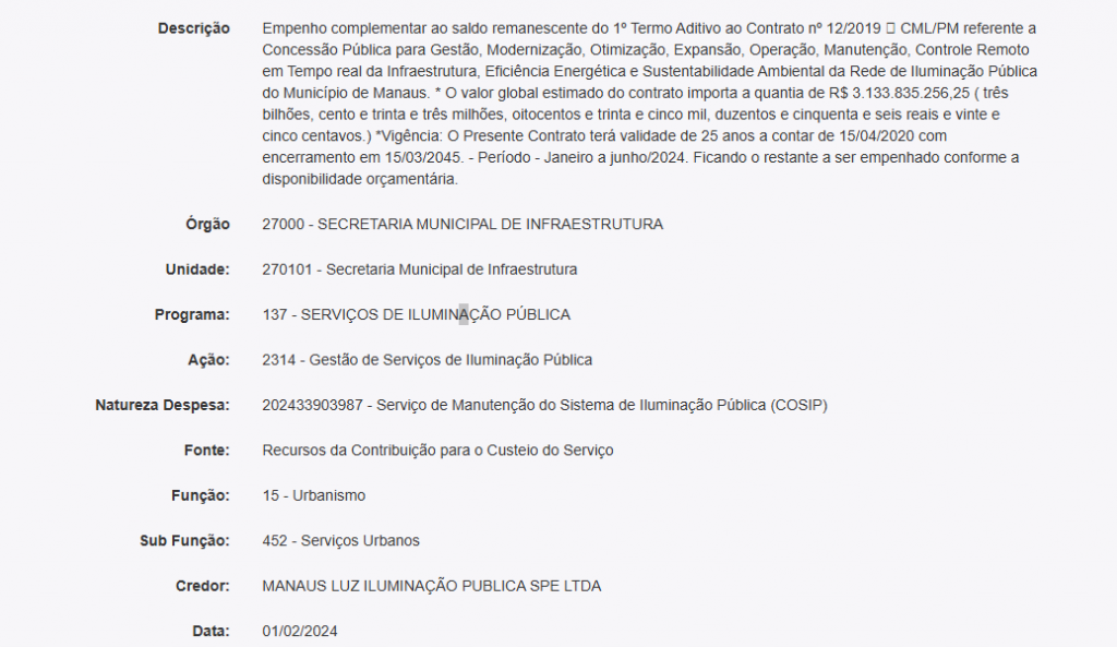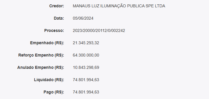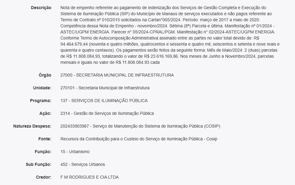 As notas de empenho apontam que o valor é referente à indenização dos serviços de gestão completa e execução do Sistema de Iluminação Pública (SIP) de Manaus, executados e não pagos, referente ao Termo de Contrato nº 010/2015.