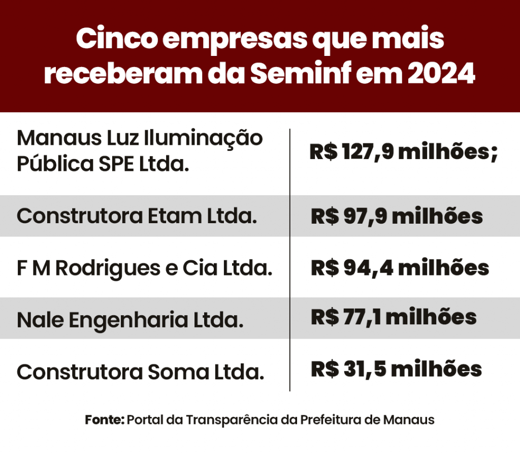 Os dados do Portal da Transparência apontam que a empresa que mais recebeu durante o período foi a Manaus Luz Iluminação Pública SPE Ltda., cujo valor ultrapassou R$ 127,9 milhões. A empresa é responsável pela concessão pública para garantir o serviço da rede de iluminação pública de Manaus. Na sequência, aparecem a Construtora Etam Ltda. (R$ 97,9 milhões); F M Rodrigues e Cia Ltda (R$ 94,4 milhões); Nale Engenharia Ltda. (R$ 77,1 milhões); e Construtora Soma Ltda. (R$ 31,5 milhões).