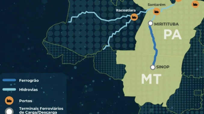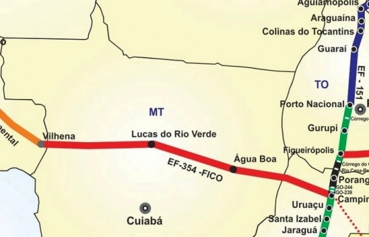 Ferrogrão: o projeto da Ferrogrão (EF-170) será construído na região Norte do estado e prevê uma linha férrea que começa em Sinop, a 403 quilômetros de Cuiabá, até o porto de Miritituba, em Itaituba (PA), distante 888 quilômetros de Belém. A extensão total é de 933 quilômetros e o investimento previsto é da ordem de R$ 12 bilhões para implantação.