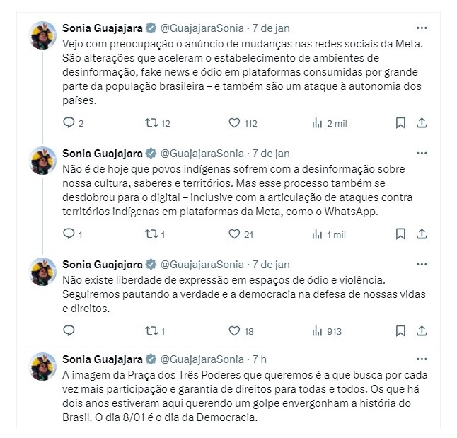 A CENARIUM tenta contato com Guajajara desde a segunda-feira, 6, para posicionamento sobre o caso, mas até o momento não houve retorno. Em seu perfil na plataforma X (ex-Twitter), a autoridade fez quatro publicações nos últimos dias, mas nenhuma faz menção ao assunto. Na terça-feira, 7, ela publicou um texto, no qual demonstra preocupação sobre a mudança de diretrizes da plataforma Meta. Já nesta quarta-feira, 9, uma nova publicação da autoridade fala sobre os ataques do 8/1 e Democracia. Veja: