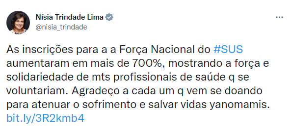 A notícia foi celebrada pela ministra da Saúde, Nísia Trindade, em postagem no Twitter. “As inscrições para a Força Nacional do SUS aumentaram em mais de 700%, mostrando a força e solidariedade de muitos profissionais de saúde que se voluntariam. Agradeço a cada um que vem se doando para atenuar o sofrimento e salvar vidas Yanomami“, escreveu.