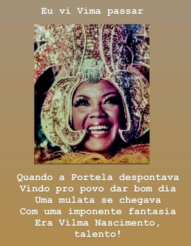 “A luta por uma sociedade mais justa e humana passa pelo combate ao racismo. O G.R.E.S Portela repudia veementemente o preconceito sofrido por Vilma Nascimento, o Cisne da Passarela, no aeroporto de Brasília, em companhia de sua filha Danielle Nascimento”, destaca o texto ao acrescentar que Vilma é um dos ícones da Portela e do Carnaval.