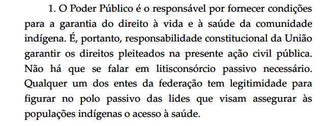 A decisão do ministro Nunes Marques reforça que o poder público é o responsável por fornecer condições para a garantia do direito à vida e à saúde da comunidade indígena. “É, portanto, responsabilidade constitucional da União garantir os direitos pleiteados na presente ação civil pública”, alegou o ministro.