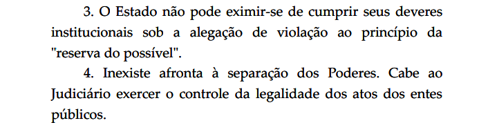 Ao STF, a União alegou que as sentenças anteriores violaram princípios da separação dos poderes e de limitações orçamentárias. A Corte proferiu a decisão contra o recurso alegando que o “Estado não pode eximir-se de cumprir seus deveres institucionais sob a alegação de violação ao princípio da ‘reserva do possível’ e que é “inexistente” a violação à separação dos Poderes.