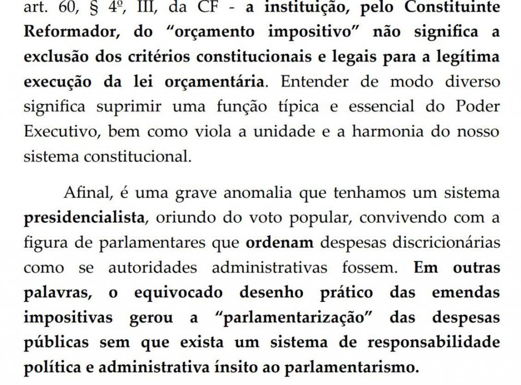 Ficaram ressalvados, no entanto, os recursos destinados a obras já iniciadas ou a ações para atendimento de calamidade pública formalmente reconhecida. “É uma grave anomalia que tenhamos um sistema presidencialista, oriundo do voto popular, convivendo com figura de parlamentares que ordenam despesas discricionárias”, afirmou Dino.