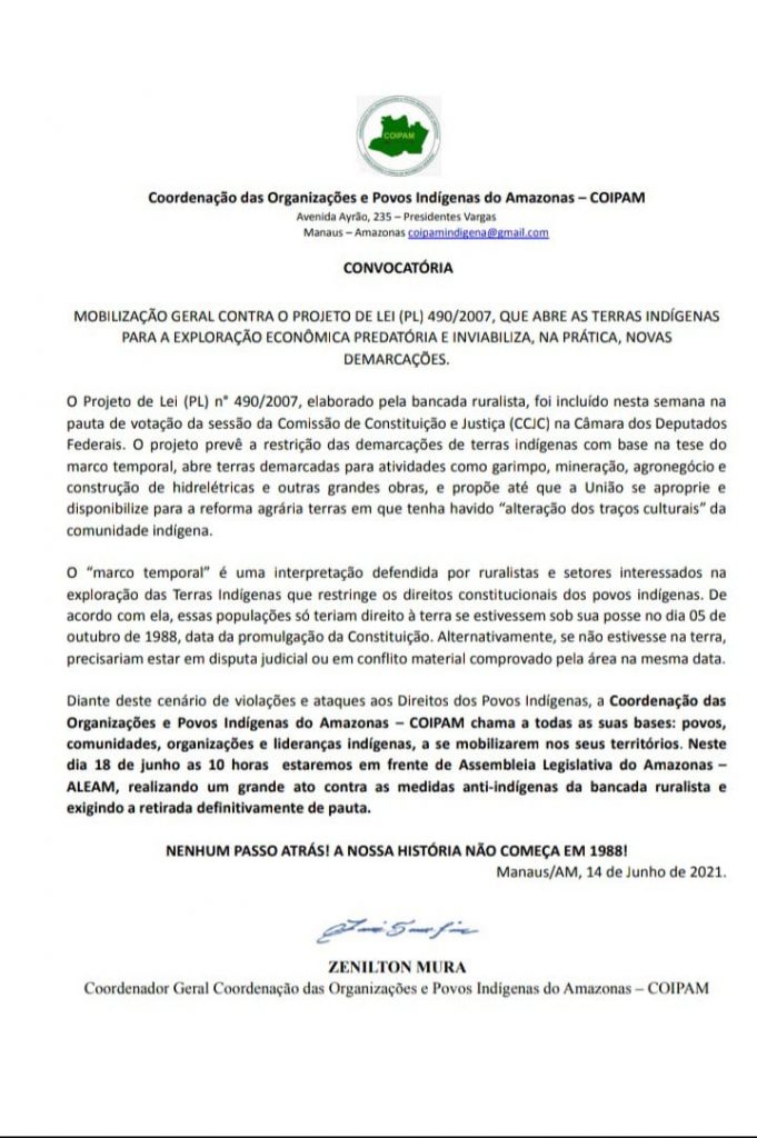 A Articulação dos Povos Indígenas já se manifestou contraria ao PL e escancara as fragilidades e dá brecha para os garimpeiros atuarem em área já demarcada pela União. “O PL 490 permite que o governo tire da posse de povos indígenas áreas oficializadas há décadas, escancara as terras indígenas a empreendimentos predatórios, como o garimpo, e, na prática, vai inviabilizar as demarcações, totalmente paralisadas pelo Governo Bolsonaro”, afirma Kretã Kaingang, da coordenação da Articulação dos Povos Indígenas do Brasil (Apib).