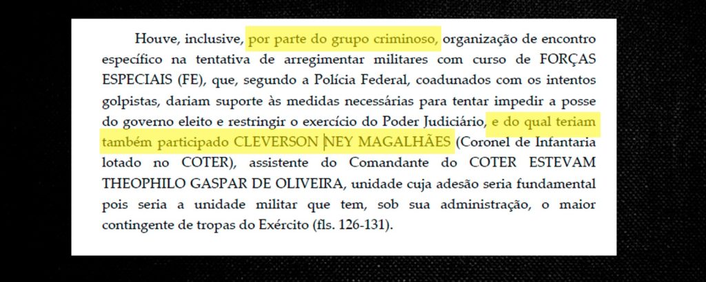 Inclusive, Cleverson participou de uma organização de encontro específico para tentar influenciar militares, com curso de Forças Especiais, com intenções golpistas, que dariam suporte às medidas para tentar impedir a posse do presidente eleito e restringir o exercício do Poder Judiciário.