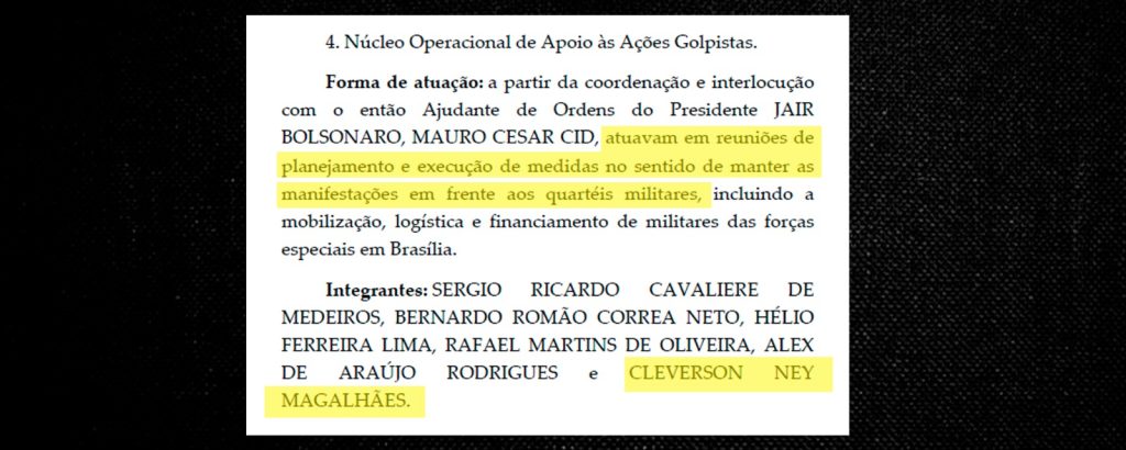 De acordo com o relatório da Polícia Federal (PF), o subcomandante fazia parte do Núcleo Operacional de Apoio às Ações Golpistas, atuando em reuniões de planejamento e na mobilização, logística e financiamento para manter as manifestações em frente aos quartéis militares.