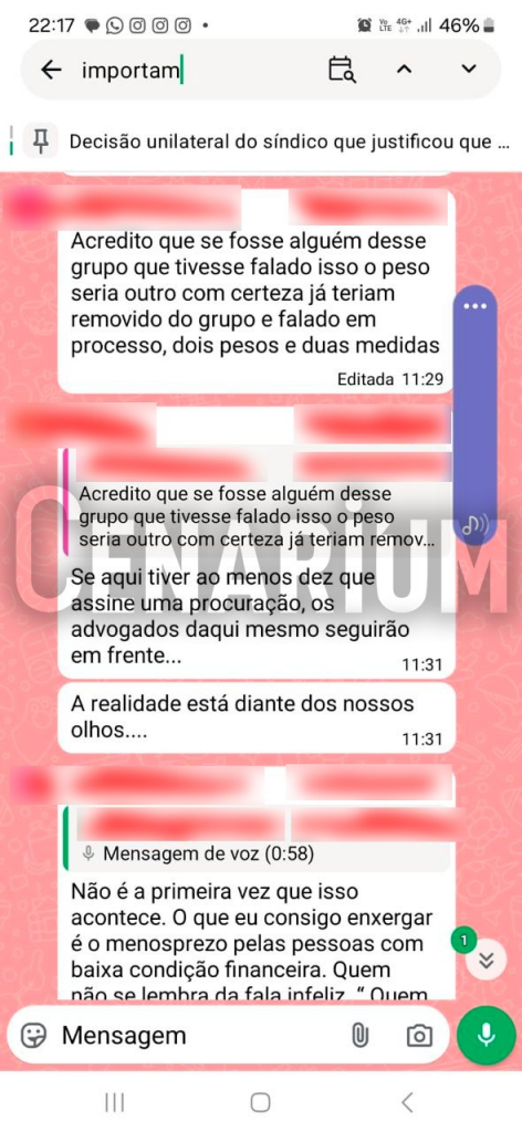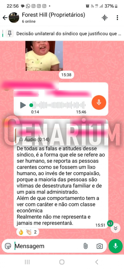 Outro integrante do grupo mencionou, em mensagem encaminhada às 12h34, que o residencial “nunca foi um condomínio de luxo”, como afirmou o síndico do local no áudio. Pouco mais de três horas depois, às 15h51, um morador escreveu que o comportamento tem haver com caráter e não com classe social. Para ele, o servidor público deveria ter compaixão pelas pessoas de baixa renda e disse que Antônio Júnior, como síndico do condomínio, não o representava. Veja captura de tela: