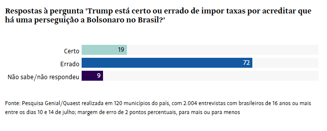 Ainda segundo a pesquisa, 57% afirmam que Trump não tem o direito de criticar o processo em que Bolsonaro é réu no Supremo. Outros 36% dizem que ele tem direito.