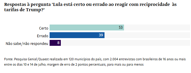 Apenas 19% dizem acreditar que o presidente americano está certo ao impor taxas com a justificativa de que há uma perseguição a Bolsonaro no Brasil. Já em relação a Lula, 39% respondem que o presidente está errado ao reagir com reciprocidade ao tarifaço —8% não souberam responder.