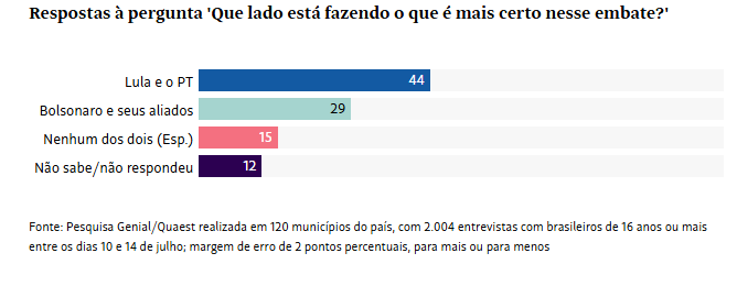 Ao responderem sobre qual lado está fazendo o que é mais certo nesse embate, 44% escolhem Lula e o PT, 29% escolhem Bolsonaro e seus aliados, 15% respondem que nenhum dos dois, e 12% não sabem.