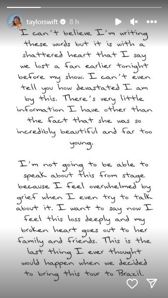 A cantora Taylor Swift também usou o Instagram para lamentar o ocorrido, afirmando estar “dominada pela tristeza”. “Não acredito que estou escrevendo essas palavras, mas é com o coração partido que digo que perdemos um fã hoje à noite, antes do meu show. Eu tenho outra coisa além do fato de ela ser incrivelmente linda e muito jovem“, escreveu ela no Instagram após o show da Eras Tour no Rio de Janeiro.