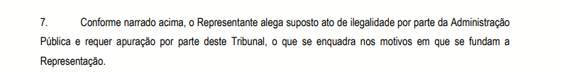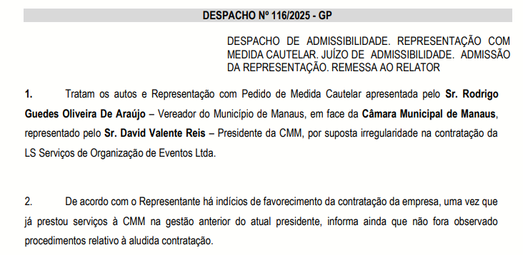 De acordo com o documento, “há indícios de favorecimento da contratação da empresa, uma vez que já prestou serviços à CMM na gestão anterior“. Em outro trecho, o documento cita que “o representante alega suposto ato de ilegalidade por parte da administração pública e requer apuração”.