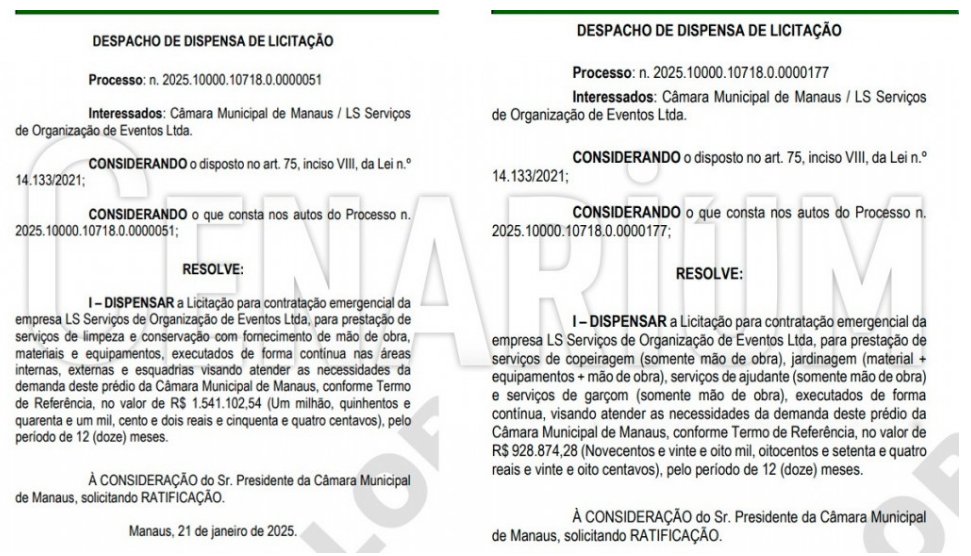 A empresa LS Serviços foi contratada pela CMM para a prestação de serviços de limpeza e conservação, e para a prestação de serviços de copeiragem, jardinagem, serviços de ajudante e de garçom. O presidente da Casa, David Reis, publicou o primeiro contrato no Diário Oficial do Legislativo Municipal (DOLM), dia 21 de janeiro, no valor de R$ 1.541.102,54. O segundo contrato foi publicado três dias depois, no dia 24 de janeiro, no valor de R$ 928.874,28. Juntos, somam um montante de R$ 2.469.976,82 e tem a vigência de 12 meses.