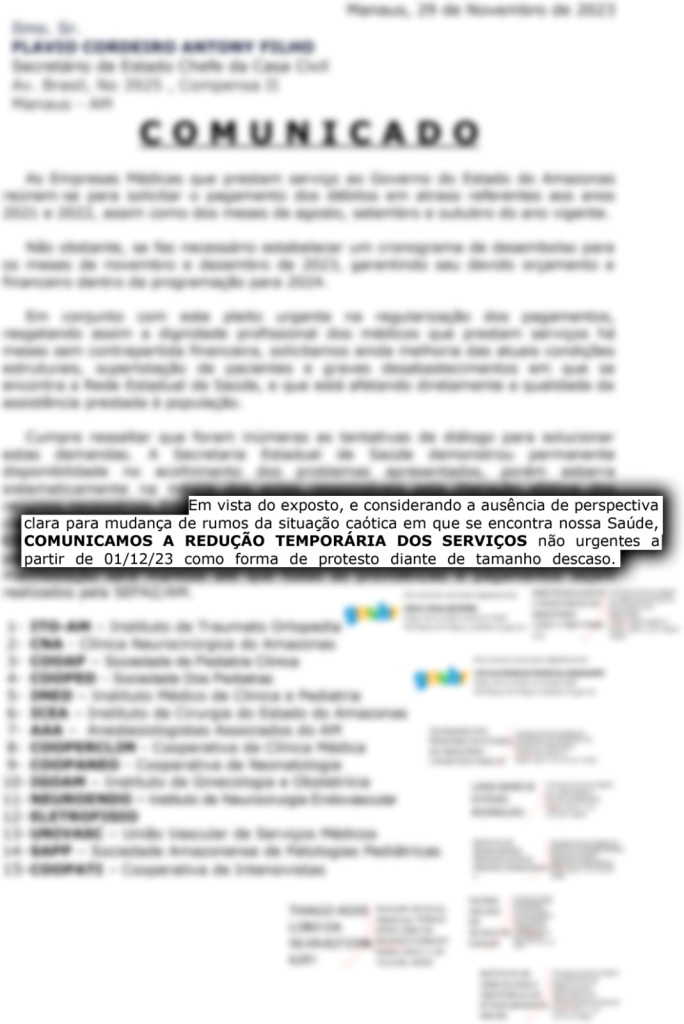 “Em vista do exposto, e considerando a ausência de perspectiva clara para mudança de rumos da situação caótica em que se encontra nossa Saúde, COMUNICAMOS A REDUÇÃO TEMPORÁRIA DOS SERVIÇOS não urgentes a partir de 01/12/23, como forma de protesto diante de tamanho descaso”, afirma o documento enviado para as instituições.