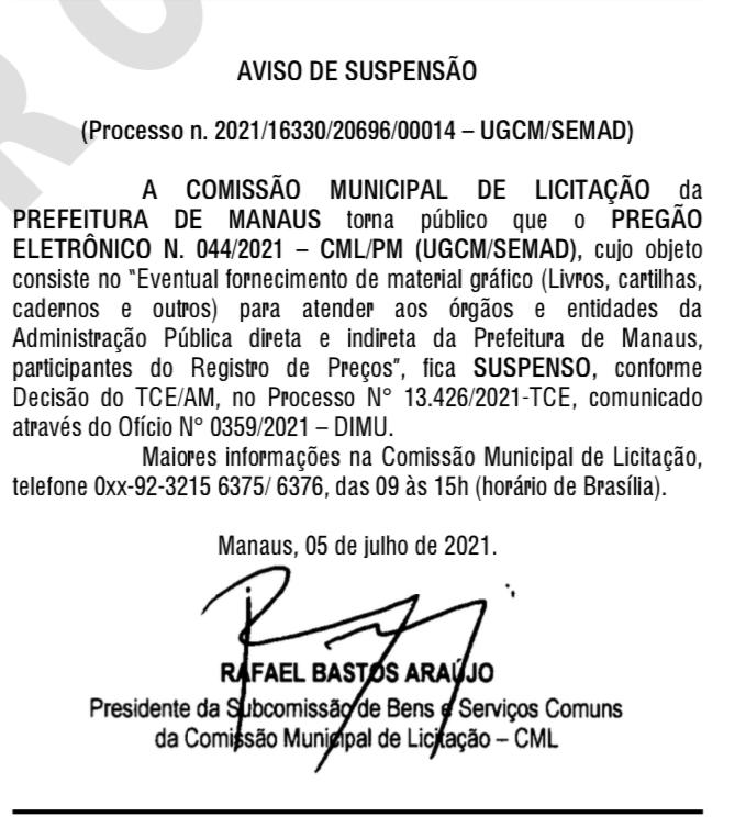 MANAUS – O conselheiro do Tribunal de Contas do Estado (TCE-AM), Júlio Pinheiro, suspendeu o Pregão Eletrônico nº 044/2021 da Prefeitura de Manaus por suspeita de irregularidades no processo licitatório. O pedido de Medida Cautelar foi formulado pela Grafisa – Gráfica e Editora Ltda., uma das empresas ganhadora do certame. A decisão do conselheiro foi publicada na última sexta-feira, 2, e determina um prazo de 15 dias para que o Executivo Municipal respondesse os indícios de imprecisões contidos no pregão.