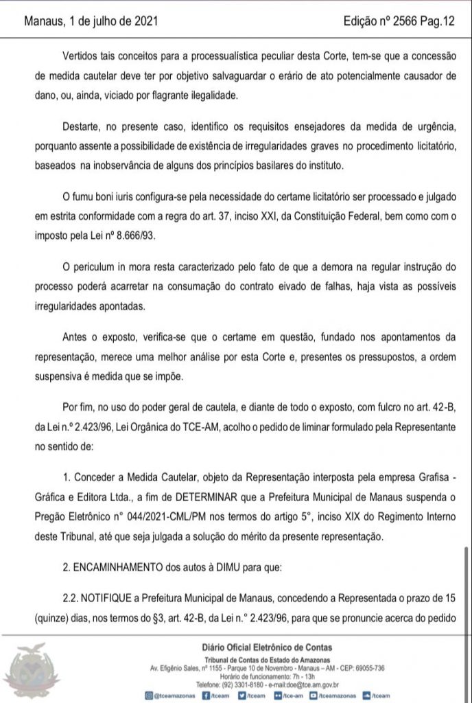 Na medida cautelar concedida, o conselheiro determinou a suspensão imediata do Pregão Eletrônico nº 044/2021 até que seja julgado o mérito da representação pela Corte de Contas. O conselheiro concedeu um prazo de 15 dias para pronunciamento da Prefeitura de Manaus a respeito dos indícios de irregularidades apontadas na representação.