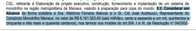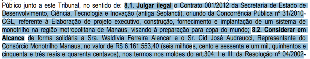 “8.1. Julgar ilegal o Contrato 001/2012 da Secretaria de Estado de Desenvolvimento, Ciência, Tecnologia e Inovação (antiga Seplancti), oriundo da Concorrência Pública nº 31/2010-CGL, referente à Elaboração de projeto executivo, construção, fornecimento e implantação de um sistema de monotrilho na região metropolitana de Manaus, visando à preparação para copa do mundo“, diz trecho da decisão.