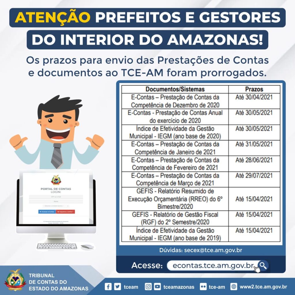 De acordo com a Portaria nº 83/2021, publicada no Diário Oficial Eletrônico (DOE) do TCE-AM, estão prorrogados os prazos, exclusivamente para os municípios do interior do Amazonas, para entrega das Prestações de Contas Anual (exercício de 2020) e Mensais (competência de dezembro/20, janeiro/21, fevereiro/21 e março/21), dos Relatórios Resumido de Execução Orçamentária (6º Bimestre/2020) e de Gestão Fiscal (2º Semestre/2020), e do Índice de Efetividade da Gestão Municipal (ano base de 2019 e 2020).