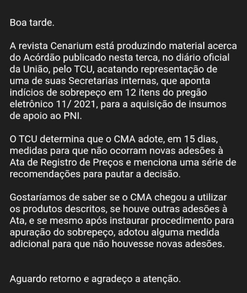 A CENARIUM tentou contato com a assessoria do CMA, via e-mail, mas até a publicação desta matéria não obteve retorno. Confira a demanda solicitada abaixo.