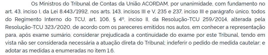 O principal argumento da Corte de Contas foi que as falhas executivas identificadas no processo podem ser resolvidas por meio do encaminhamento dos fatos à Seinfra para adoção de providências para a correção. O TCU afirmou, em um trecho da decisão, que “apesar de os indícios de irregularidades se revestirem de risco, materialidade e relevância (…), eles não demandam, neste momento, a atuação desta Casa”.