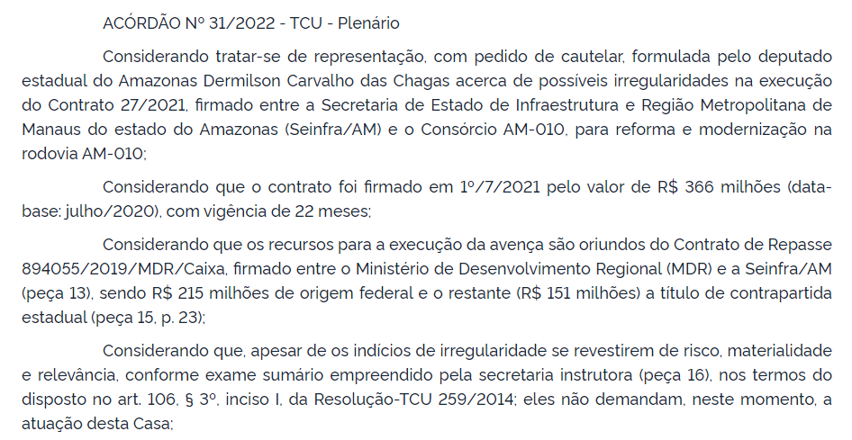 MANAUS — O Tribunal de Contas da União (TCU) negou, por unanimidade, o pedido de medida cautelar de autoria do deputado estadual de oposição Dermilson Chagas (Podemos), que alegava irregularidades no contrato firmado, em 2019, entre a Secretaria de Estado de Infraestrutura (Seinfra) e o Consórcio AM-010 para obras de revitalização da rodovia estadual que liga Manaus a Itacoatiara.