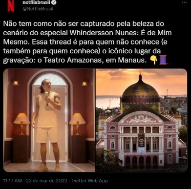 “@NetflixBrasil – Não tem como não ser capturado pela beleza do cenário do especial Whindersson Nunes: É de Mim Mesmo. Essa thread é para quem não conhece (e também para quem conhece) o icônico lugar da gravação: o Teatro Amazonas, em Manaus”, publicou o serviço de streaming.