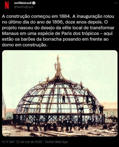 “@NetflixBrasil – O Teatro Amazonas foi praticamente todo ‘importado’: o mármore do hall de entrada é de Carrara, na Itália; o ferro das colunas é escocês; o piso é português e o bronze dos lustres, francês”, destacou no post desta terça-feira.
