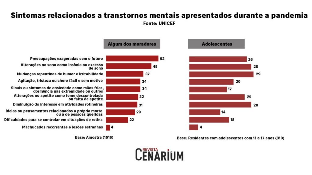 A pesquisa “Impactos primários e secundários da Covid-19 em Crianças e Adolescentes”, perguntou a adultos como a pandemia está impactando os adolescentes que vivem em nos domicílios. Entre os entrevistados, 56% disseram que algum adolescente da casa apresentou um ou mais sintomas. Os sintomas mais sentidos foram mudanças repentinas de humor e irritabilidade (29%); alteração no sono como insônia ou excesso de sono (28%); diminuição do interesse em atividades rotineiras (28%); e preocupações exageradas com o futuro (26%).