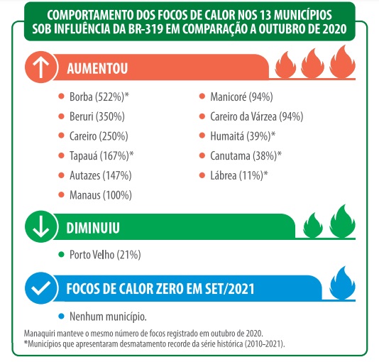 Segundo os dados do Observatório BR-319, a Amazônia Legal apresentou uma redução de 36% no número de focos de calor, se comparados ao mesmo período do ano de 2020. O Estado de Rondônia também apresentou uma redução de 27%. Em contrapartida, no Amazonas e nos 13 municípios da BR-319, houve um aumento nos números de focos de calor se comparados ao mês de outubro de 2020. Com percentuais de 40% e 23% respectivamente.