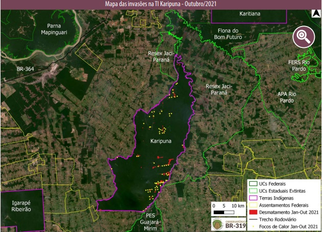 De acordo com o levantamento, Karipuna liderou o ranking de desmatamento em outubro, entre as 69 terras indígenas monitoradas pelo observatório, e bateu o recorde da série histórica para o mês, com perda de 145,53 hectares. Além disso, por causa das invasões que ameaçam o local, a segurança alimentar dos Karipuna está cada vez mais comprometida. Os rios Jaci-Paraná e os igarapés Fortaleza, Formoso e Trindade sofrem com a falta de peixes.