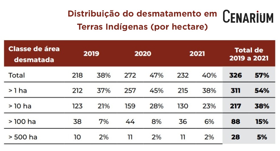 Das 25 TIs presentes na tabela, 11 tiveram desmatamento acima de 500 hectares no último ano (o que equivale a 2%). Entre os anos de 2019 e 2021, houve crescimento da degradação em todas as categorias fundiárias, exceto em Terras Indígenas (TIs).