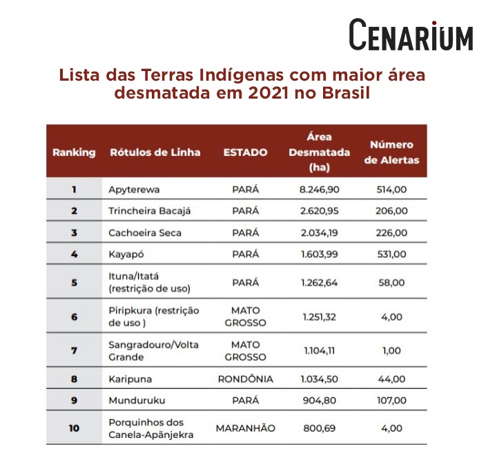 A liderança do desmatamento, no Pará, corresponde a 24,31% da área devastada no País. Cinco dessas Terras indígenas estão no topo das mais desmatadas, sendo elas: Apyterewa, com 8.246,90 hectares (ha); Trincheira Bacajá com 2.620,95 ha; Cachoeira Seca com 2.034,19 (ha); Kayapó com 1.603,99 ha e Ituna/Itatá com 1.262,64 ha, todas localizadas no Pará.