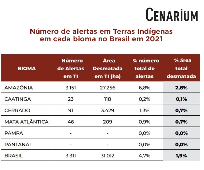 Foram monitoradas 573 Terras Indígenas, no Brasil e, de acordo com a pesquisa, 232 delas tiveram, pelo menos, um evento de desmatamento no ano passado. A devastação em TIs representa 4,7% do total de alertas e 1,7% da área total desmatada no Brasil em 2021.