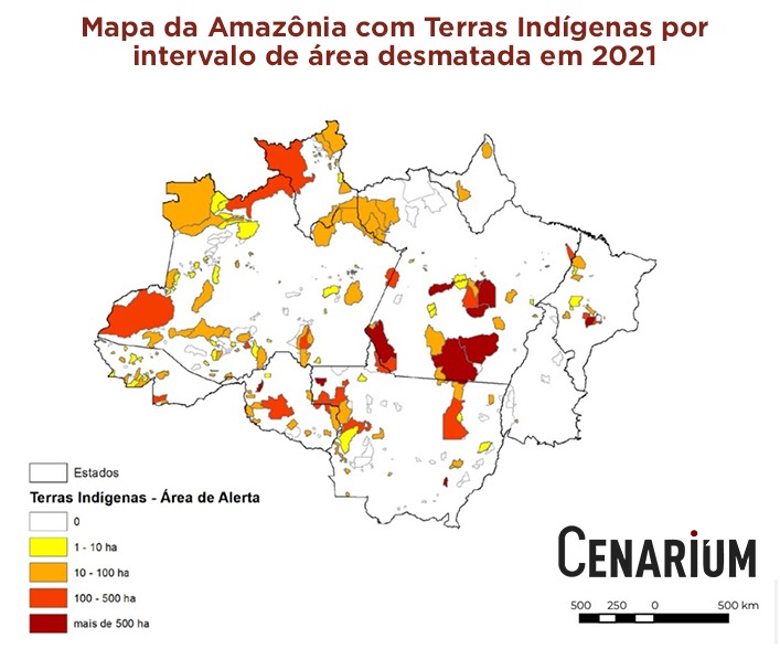 Apesar de não aparecer entre as 10 TIs mais desmatadas, o Amazonas possui as TIs: Menkragnoti com 503,07 hectares desmatados e 36 alertas; Tenharim Marmelos com 490,92 hectares destruídos e 11 alertas; Andirá-Marau com 347,43 hectares desmatados e 134 alertas; Yanomami com 307,40 hectares desmatados e 87 alertas; Jauary com 252,85 hectares desmatados e 9 alertas e Sissaíma com 227,52 hectares desmatados e 15 alertas de desmatamento.
