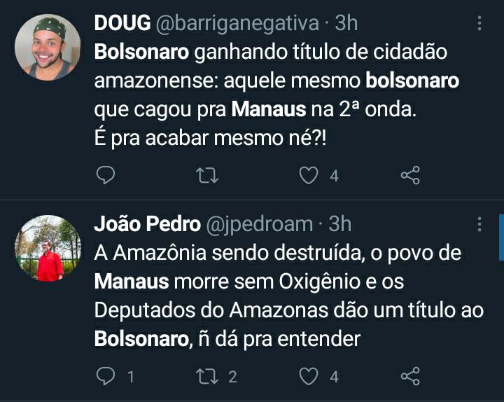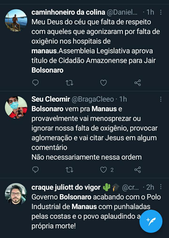 Um outro internauta afirmou que a destruição da Amazônia e o descaso do presidente diante da falta de oxigênio em Manaus, enquanto os parlamentares prestam homenagem ao presidente. “Não dá para entender”, comentou, no Twitter. Outra pessoa chamou a atenção para a visita do presidente e uma eventual aglomeração que a passagem de Bolsonaro pode provocar.