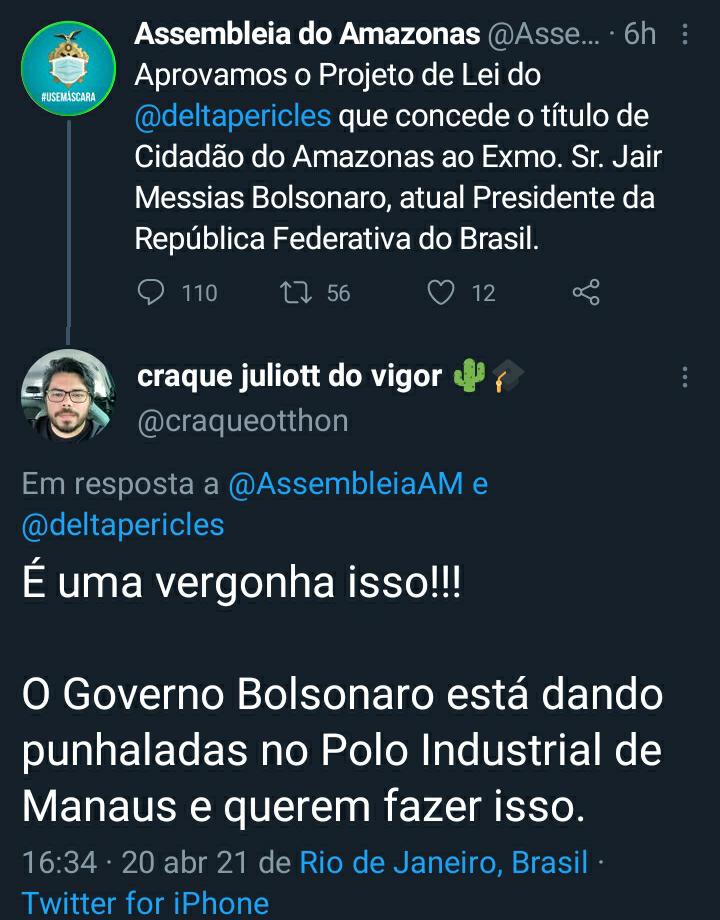 “O presidente Jair Bolsonaro é um grande brasileiro e, independente de suas posições político-ideológicas, se mereceu a aprovação quase unânime do parlamento estadual é porque é merecedor de tamanha homenagem. Esperamos, portanto, que com a honraria amazonense ele ajude a preservar a Zona Franca de Manaus, que é nosso tesouro econômico”, salientou.
