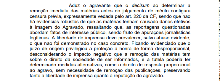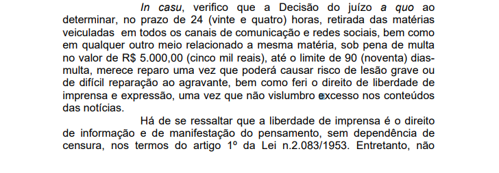 O magistrado destacou que a decisão que retirou os conteúdos jornalísticos do ar merece reparo. Segundo Vieira Júnior, a suspensão das matérias poderá “causar risco de lesão grave ou de difícil reparação ao agravante, bem como fere o direito de liberdade de imprensa e expressão, uma vez que não vislumbro excesso nos conteúdos das notícias”. Veja trecho: