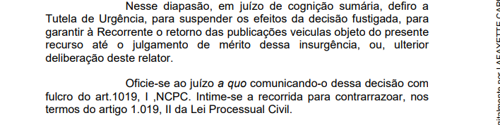 “Defiro a Tutela de Urgência, para suspender os efeitos da decisão fustigada, para garantir à Recorrente o retorno das publicações veiculas objeto do presente recurso até o julgamento de mérito dessa insurgência, ou, ulterior deliberação deste relator”, diz outro trecho da decisão. Veja: