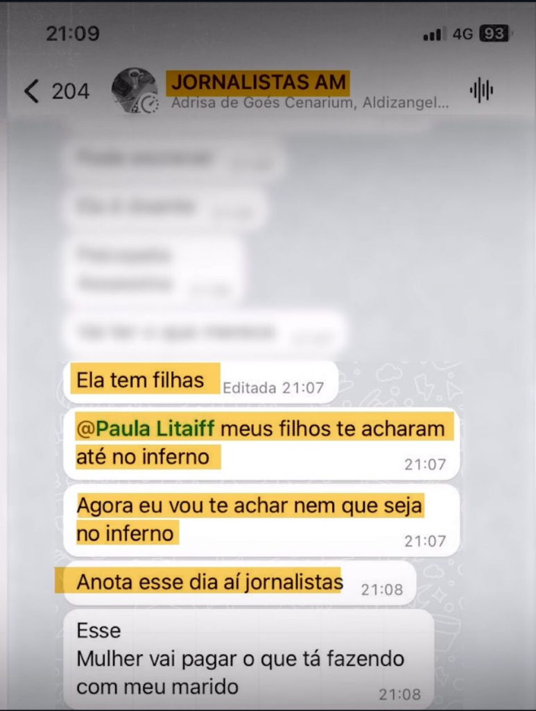“(…) ela vai pagar caro (…) Ela tem filhas. Ela sabe onde está se metendo. Quem paga são os filhos. A vida tem volta. (…) Pode escrever. Vai ter o que merece. Ela tem filhas. Paula Litaiff, meus filhos te acharam até o inferno. Agora vou ter que te achar nem que seja no inferno (sic)”, ameaçou Cileide Moussallem, por meio do número de telefone (92) 99269-xxxx. Veja prints: