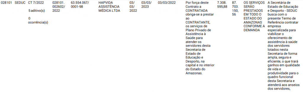 O contrato 007/2022 foi firmado pela Seduc para fornecer atendimento médico aos servidores da secretaria, na capital e no interior do Amazonas, que somavam, aproximadamente, 20 mil beneficiários. O valor do contrato era de R$ 87 milhões.