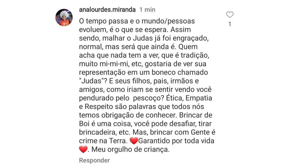Para o psicólogo e ativista do movimento afro do Amazonas, Alberto Jorge, é preciso moderação. “Acredito que a malhação do judas é uma tradição, e que precisa se manter, mas também acredito que a malhação precisa ser ressignificada e, isso pode, de alguma forma, torná-la politicamente correta, o que, evidentemente, pode descaracterizar a brincadeira”, opinou. “Lembro, quando criança, que na malhação, as críticas eram variadas, falava-se do vizinho avarento, daquele que não tomava banho, dos sovinas, pães-duros e até os que não tinham casado”, recordou. “Claro que, nos dias de hoje, é preciso muito cuidado”, alertou.