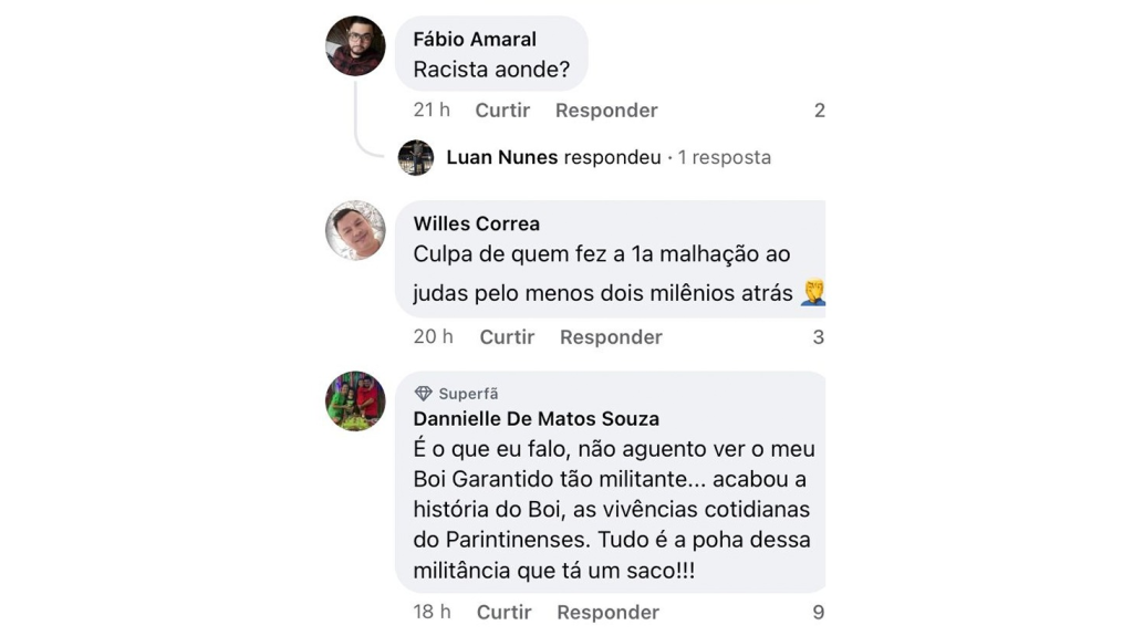 Presidente da Articulação Amazônica dos Povos e Comunidades Tradicionais de Terreiro de Matriz Africana (Aratrama), Alberto Jorge não vê preconceito na manifestação em frente ao reduto do Caprichoso, em Manaus. “Só o fato de ser o boneco preto, representando um homem preto, eu não vejo maiores problemas, e se fosse o judas de um homem branco, teria algum potencial ofensivo?, questionou. Penso que o que pode caracterizar o crime de racismo e injúria racial é o que está escrito na placa”, observou.