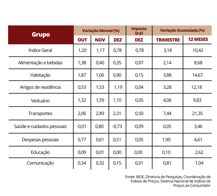 VILHENA (RO) — As contas do fim de ano, já infladas pelas comemorações, devem fechar ainda mais altas no orçamento dos brasileiros, principalmente para quem vive de um salário mínimo. Isso porque o Índice Nacional de Preços ao Consumidor Amplo (IPCA) fechou dezembro com alta anual acumulada em 10,42%, o maior patamar desde 2015. Por outro lado, o índice relativo apenas ao mês de dezembro, de 0,78%, foi 0,39 ponto porcentual (p.p) inferior ao de novembro deste mesmo ano (1,17%). Mesmo assim, os setores de transporte, moradia e alimentação, com os quais as famílias mais gastam no fim de ano, puxaram o maior encarecimento do IPCA dos últimos seis anos.
