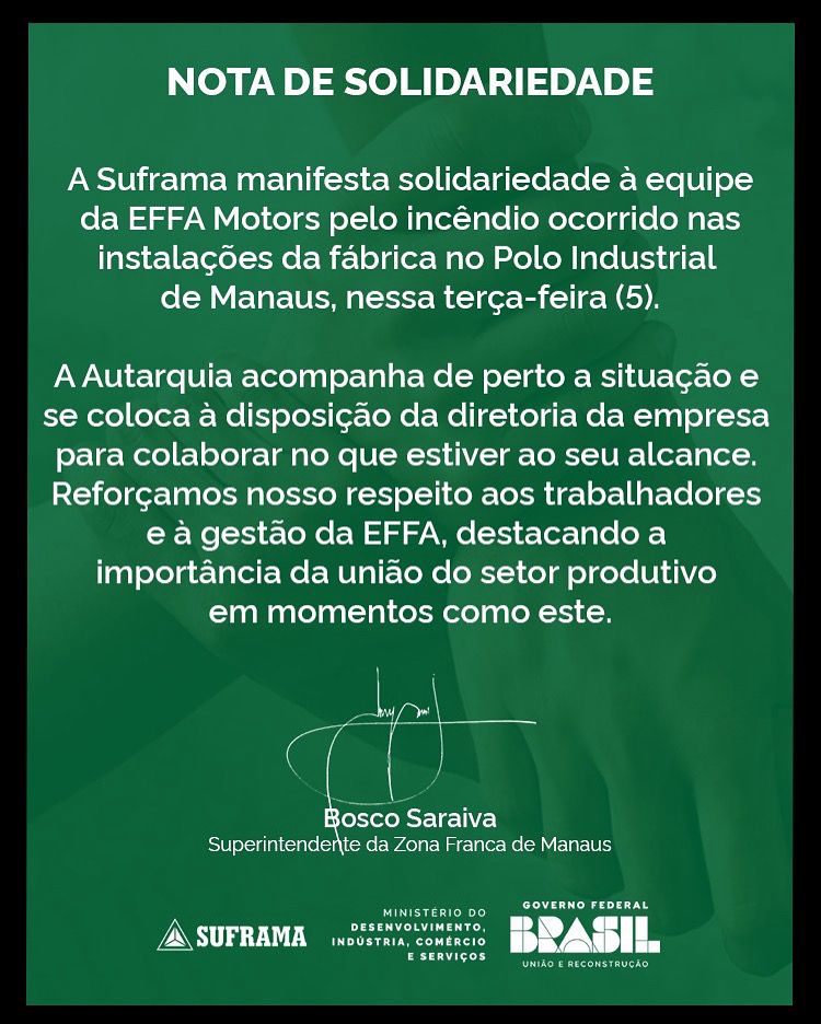 “É a perda de uma empresa importante. Isso é sempre muito traumático. Nós ainda não podemos avaliar a extensão disso para o Polo Industrial de Manaus, porque todos nós estamos muito entristecidos com o ocorrido. O momento agora é de cautela e de apoio à diretoria da Effa”, disse o dirigente em declaração à imprensa.