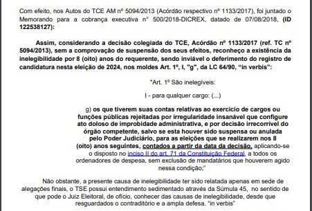 “Considerando a decisão colegiada do TCE, Acórdão no 1133/2017 (ref. TC no 5094/2013), sem a comprovação de suspensão dos seus efeitos, reconheço a existência da inelegibilidade por 8 (oito) anos do requerente, sendo inviável o deferimento do registro de candidatura nesta eleição de 2024”, diz trecho da decisão.